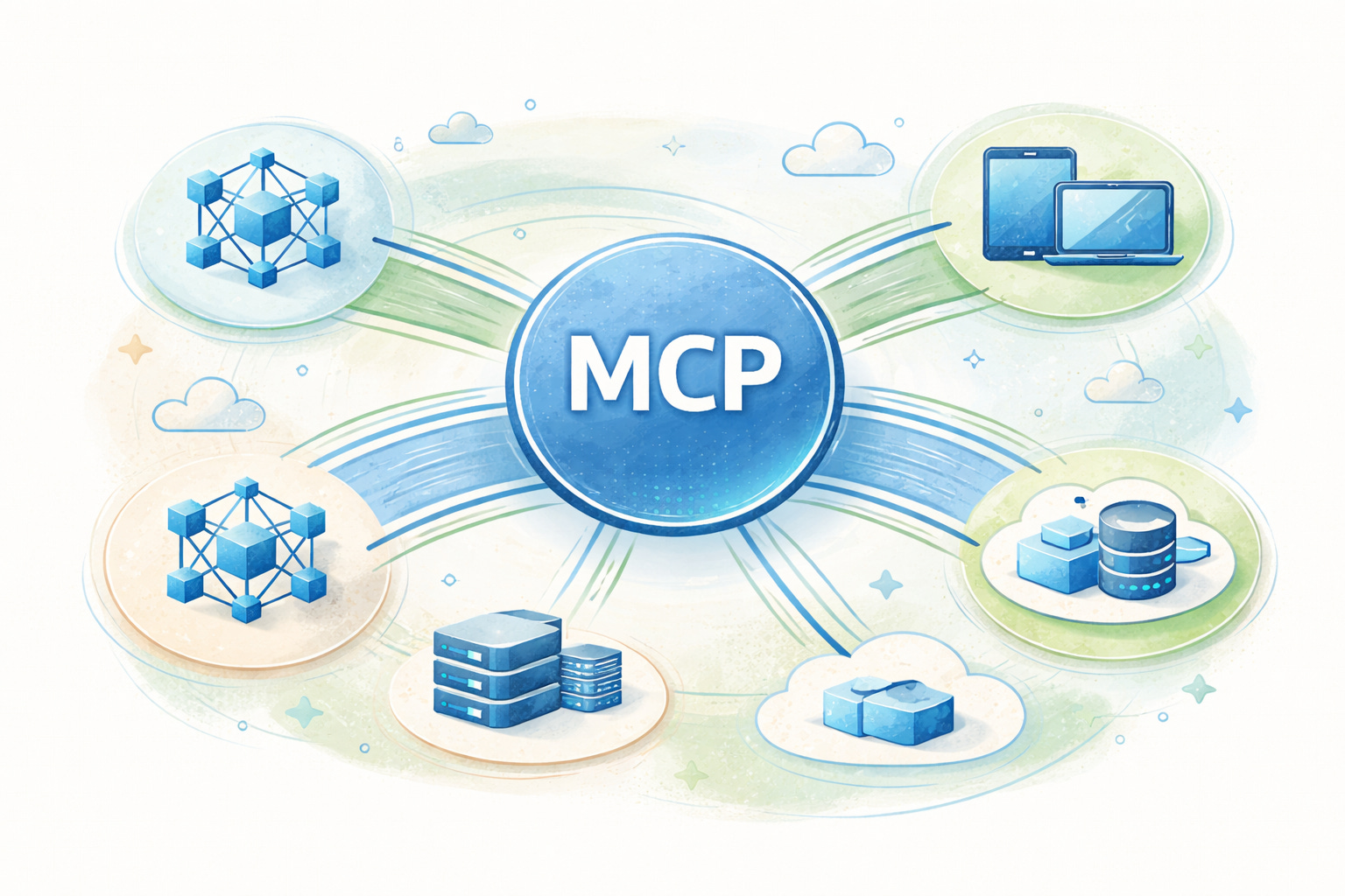 Prompt: A clean, modern diagram illustrating the Model Context Protocol (MCP) architecture with interconnected nodes and data flow pathways. The central hub displays "MCP" in bold sans-serif lettering, surrounded by geometric representations of AI models, servers, and client applications connected by flowing lines and arrows. The design uses a professional blue and white color scheme with subtle gradients, set against a minimalist background with soft grid patterns. Technical annotations and connection labels are scattered throughout the diagram, emphasizing the protocol's role in facilitating communication between different AI systems and applications. Formato 16:9