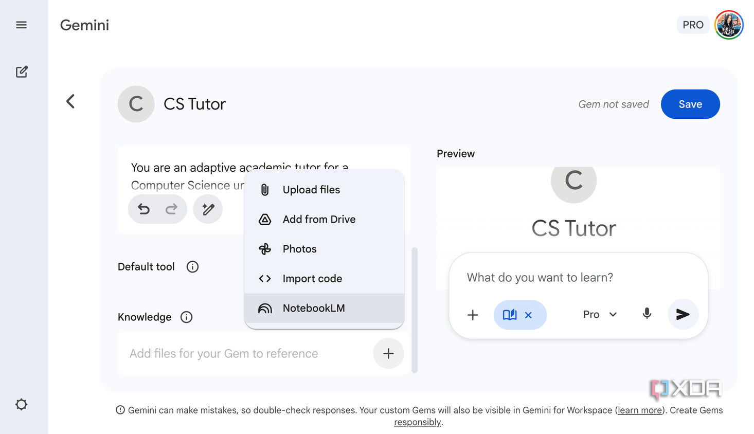 Cómo usarlo sin liarla: en Gemini, añade el cuaderno desde el botón “+” y selecciona NotebookLM, seleccionas el cuaderno correspondiente que aporta conocimiento al Gem y listo; y si trabajas con Workspace, fíjate porque esto depende de que NotebookLM esté habilitado por tu admin.