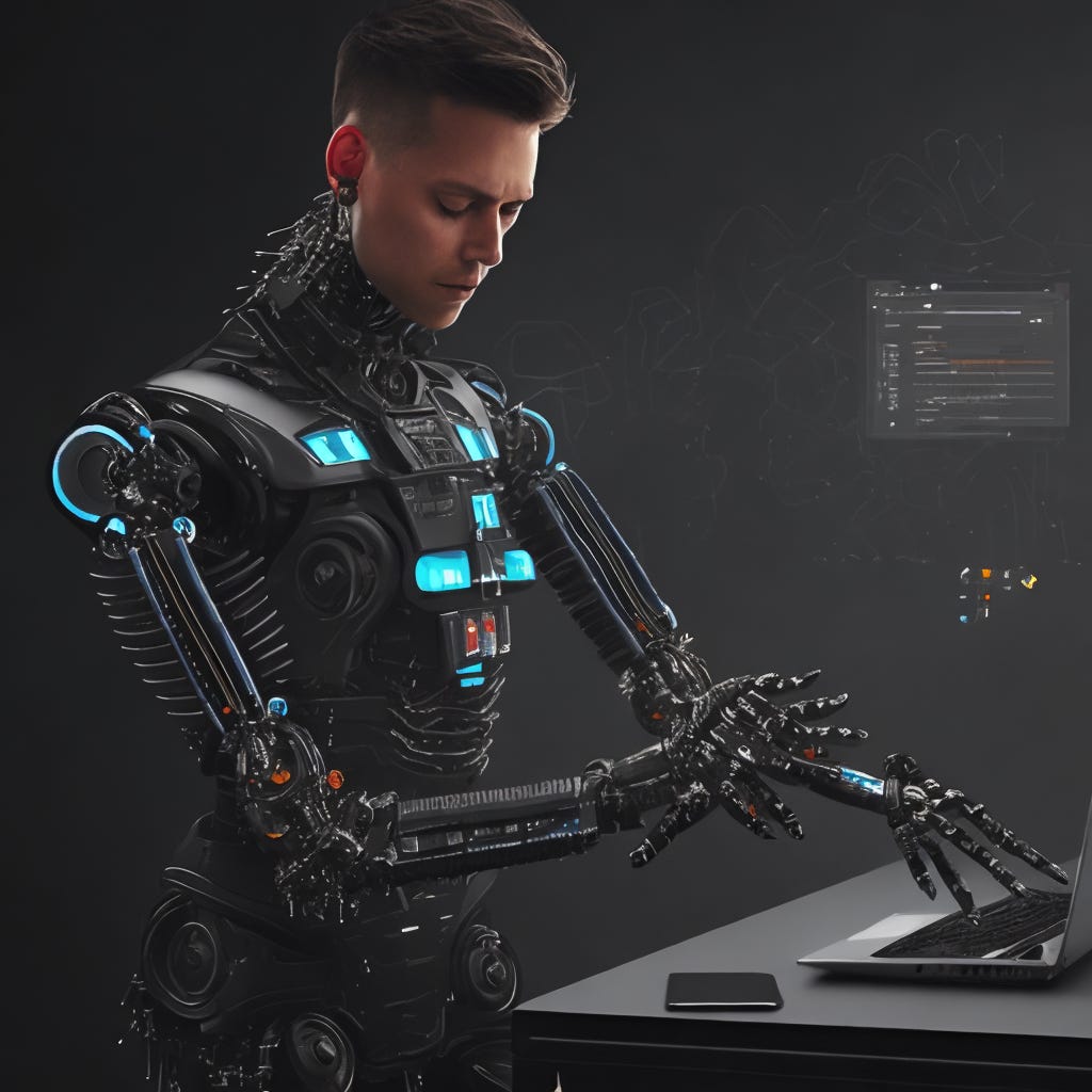 Imagen generada en PlaygroundAi usando el promtp: a-programmer-multi-task-working-wearing-several-bionic-robotic-arms-work-in-a-computer-sharp-foc-