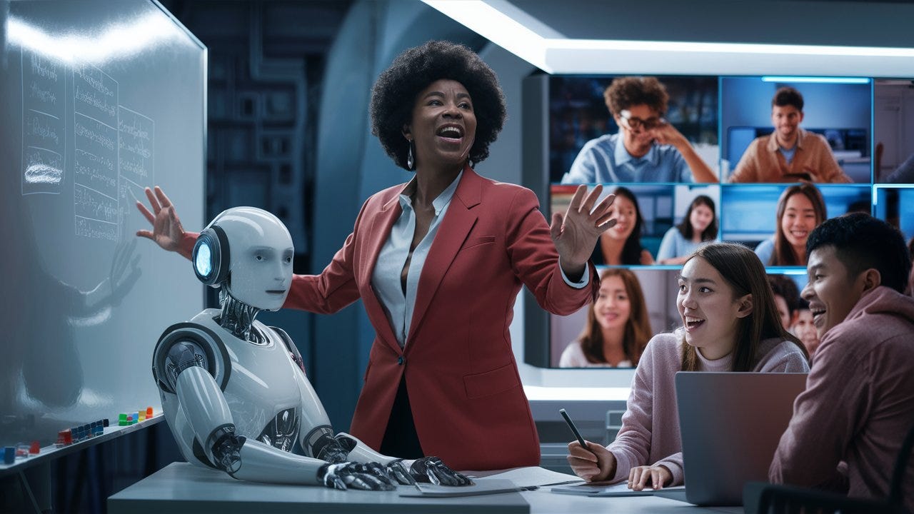 Prompt: A groundbreaking image of a visionary teacher and an advanced AI generator working together in an online educational setting. The teacher, standing boldly in front of a gleaming whiteboard, passionately gestures towards the material. Beside the teacher, a sophisticated, futuristic AI generator sits, ready to assist. The background showcases a modern virtual classroom with engaged students participating via Zoom, their expressions a blend of wonder and eagerness. The atmosphere embodies the pioneering spirit of technology in education, emphasizing its limitless potential.
