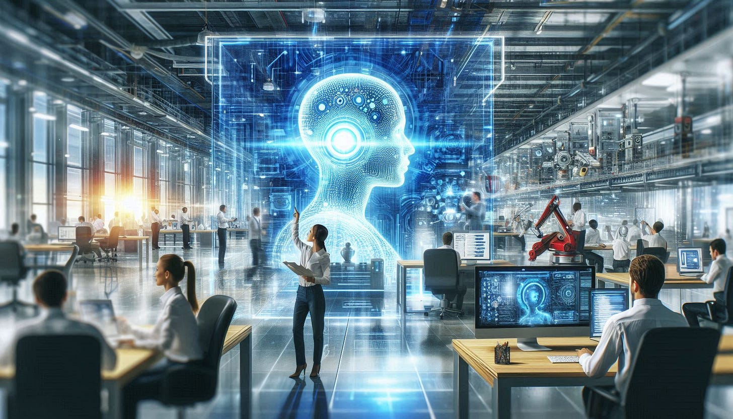 Prompt: Una imagen conceptual representando la transformación del entorno laboral gracias al impacto de la Inteligencia Artificial (IA). En el centro, una figura humana y una figura de IA se encuentran trabajando en conjunto en un ambiente de oficina moderno y futurista. La iluminación es luminosa y vibrante, reflejando la intensa productividad y el avance tecnológico. En el fondo, otros trabajadores realizan tareas en entornos de trabajo innovadores, mientras una maquinaria avanzada se observa en el horizonte. La imagen transmite un mensaje de colaboración entre la humanidad y la tecnología, y la posibilidad de un futuro laboral más eficiente y productivo.