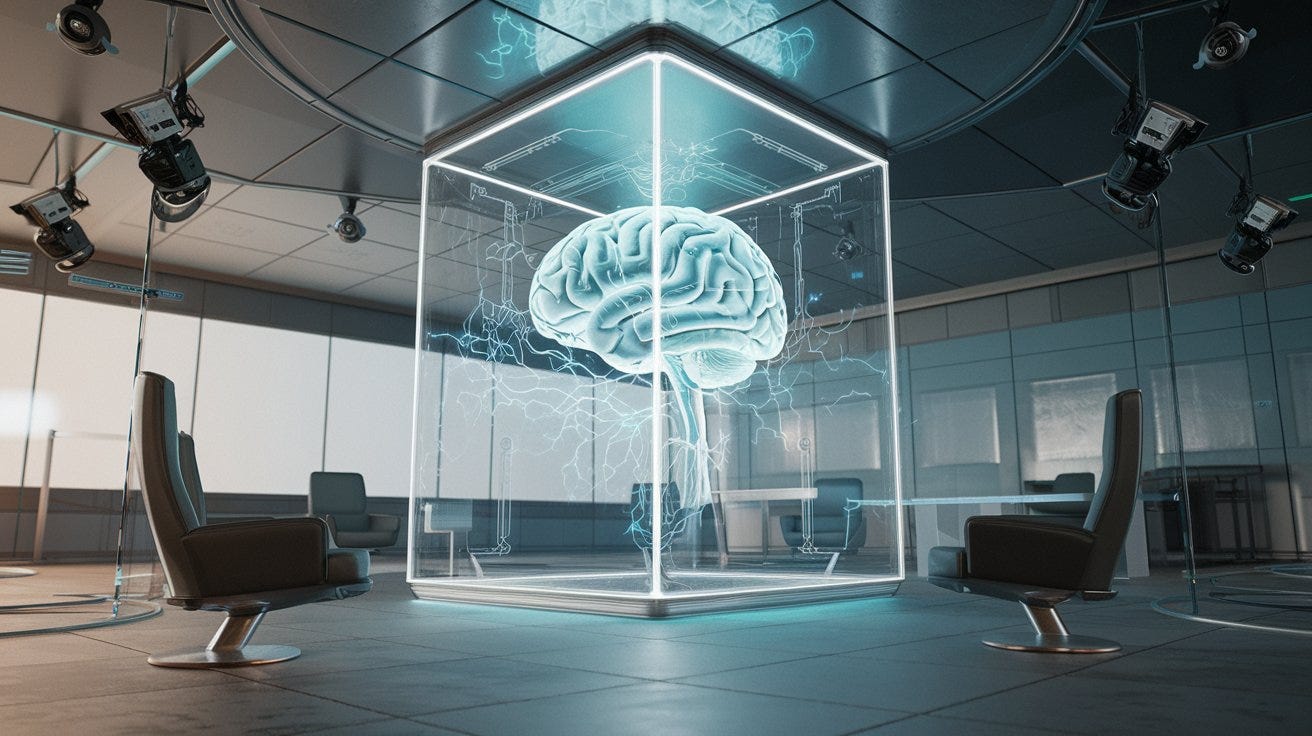 Prompt: A cinematic shot of a futuristic room with a large, transparent cube in the center. Inside the cube, there's a human brain with glowing blue synapses. The room has a few chairs and a table. The walls and ceiling are made of glass. There are multiple cameras and sensors in the room. The floor is made of tiles. The lighting is soft.